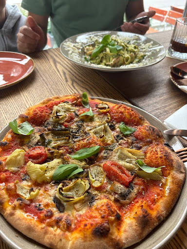 The staff was very friendly and nice. They were the highlight of our meal. Our food arrived before our 2 glasses of wine. The salad Caesar was drenched in dressing. It was more like salad soup and tasted nothing like Caesar. It was more like watered down Italian dressing. Our pizza lacked any flavor and that’s probably because there was basically nothing on it. A few mushrooms and prosciutto but I’m not sure there was any cheese, I was able to pour the parm they sent out with our bread on it to try and help with the flavor. and the dough was not airy and full it was flat and chewy. Such a...
