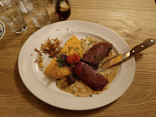 However, there were a few issues with the food and our experience was not the best. We started with cheese soup, which had a very good taste, but was not warm enough, ending up getting cold after a few minutes at our table. Order then a salad, which was good. With the normal dishes, we ordered a spinach ravioli, which was kind of dry and not seasoned enough. We understand that at the menu there is no description of a sauce, but we were at least expecting a little bit. At last, we also ordered some deer meat with pumpkin puree. The puree was wonderful. The meat was a bit too raw and not seasoned enough.