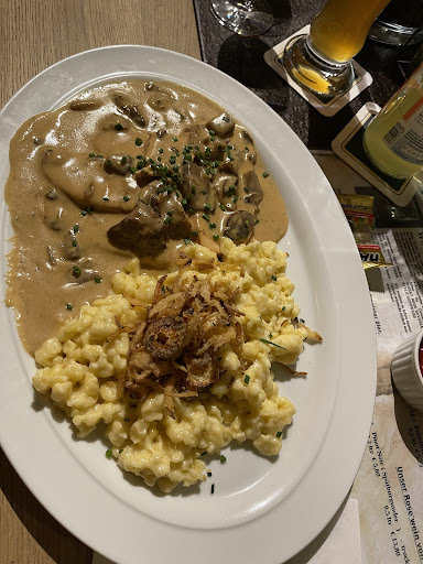 Bedienung und Dauer: Das Lokal war zu 70-80% gefüllt und wir mussten lange warten. 1h 5min von Essensbestellung bis Ankunft der Gerichte. Mit der Begrüßung und ersten Getränkebestellung waren wir noch guter Dinge. Das ging fix. Das Personal ist sehr freundlich aber sichtlich gestresst gewesen (was nicht schlimm ist) Ärgerlich ist es jedoch wenn 5x das gleiche Essen bestellt wird mit 4x davon der gleichen Beilage und 1x anders. Wir dann über 1h auf das Essen warten und dann die Beilagen genau vertauscht sind. Das "1x anders" kam dann 4x, und umgekehrt. Bei Sonderwünschen wäre ich hier also Vorsicht. Wir hatten nur aus 3 möglichen Beilagen ausgewählt und das klappte schon nicht. Gott sei Dank brachte man uns dann die richtige Beilage als extra direkt innerhalb von 5min dazu. Kostenlos. Man denkt sich, "stell dich halt nicht so an und iss es trotzdem". Aber wenn man Sicht auf Spätzle 1h lang freut...
