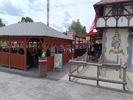 Im Park selbst wohl noch die beste Möglichkeit, was vernünftiges zu essen zu bekommen. Hatten Currywurst und Pommes, beides war soweit gut und hat geschmeckt. Pommes werden automatisch frisiert, gute Sache. Die Burger sahen ok aus, Brötchen aus der Tüte. Ob geschmacklich gut können wir nicht beurteilen. Insgesamt kann man es empfehlen, die Preise sind natürlich freizeitpark-typisch nichts für den schmalen Geldbeutel. Portion Pommes um 4€, ein Bürger zwischen 6,50 und 9€, Softgetränke ca. 4€/0,5l.(Stand Mai 2025) Würde wieder kommen.