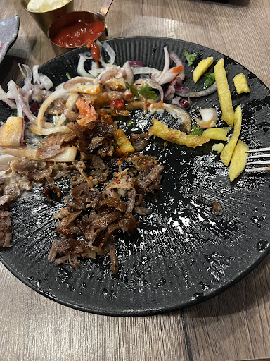Essen: Schöne große Portionen, sieht sehr lecker aus. Wir hatten einen Grillteller, Hähnchen Spieß Dürüm (Tavuk Şiş Dürüm), Kalb Spieß Dürüm und ein Hähnchemschnitzel. Zum Nachtisch bekamen wir den baklava der zum Menü gehörte und zusätzlich Künefe. Vorab bekamen wir Pita frisch gebacken dazu Scharf, Zaziki und eine Möhrenjoghurtmischung. Sehr lecker. Der Hähnchen Dürüm und der Kalb Dürüm waren auch sehr lecker. Das Hähnchenschnitzel war leider sehr matschig, einfach ungenießbar. Auf dem Grillteller befand sich Dönerfleisch, Adana Spieß, Hähnchenspieß, eine Frikadelle und Kalbfleisch. Adana war nicht ganz durch und die Frikadelle naja. Unser Nachtisch ein Desaster. Ich meine hier die extra bestellten Künefe. Kamen total verbrannt an unseren Tisch. Schmeckten überhaupt nicht gut!