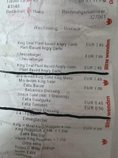 Read moreAbsolut Unterirdisch wenn ich könnte würde ich minus 5 Sterne geben !!!Extrem langsam und unhöflich geben die Sachen öfter falsch raus du stehst an der Kasse und wartest und es werden private Handy Gespräche geführt!Klar man kann ein Gespräche auch privat führen sollte das aber kurz halten ich habe über 6 min gewartet. Wenn ich die Burger auspacken sind diese Absolut mit Ketchup und Mayonnaise zugeschmiert weit über der Norm was drauf sein sollte ich kann das beurteilen da ich lange zeit in einem anderen Burger King Restaurant gearbeitet habe und wenn wir uns so verhalten hätten gab es Abmahnungen oder zumindest Kritikgespräche! GUT GEMEINTEN TIP AN DIE GESCHÄFTSFÜHRUNG DA ICH MAL DAVON AUSGEHE DAS ES EIN FRANCHISE IST SO VERLIERT IHR KUNDEN SETZT IHRE GESUNDHEIT AUFS SPIEL UND ZIEHT DEN SOWIESO SCHON ANGESCHLAGENEN NAMEN VON BURGER KING NOCH WEITER RUNTER IHR SOLLTET GANZ SCHNELL WAS...
