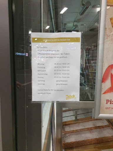 Read moreWir sind extra für Brezel, die von Ditsch warm am besten schmecken, am Sonntag hier hingefahren. Die Öffnungszeiten hier im Netz zeigen, dass der Laden geöffnet ist. Vor Ort angekommen, zeigt ein kleines Schild und die offensichtlich verschlossene Theke, dass dem nicht so ist. Das sind wirklich Internet-Basics, die eine große Firma wie Ditsch beherrschen sollte. Wir haben uns daraufhin bei der Konkurrenz schräg gegenüber eingedeckt.