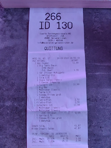 Das Restaurant wird immer schlechter. Abends ist die Bedienung nicht serviceorientiert. Kein McDonald's Standard. Stattdessen läuft es leider am drive leider so ab: Ihre Bestellung bitte, fahren sie zum 2.ten Schalter. Keine Begrüßung, kein danke usw. Am 2.ten Schalter bekommt man ebenfalls keine Begrüßung, sondern man wird angeschaut ob man nicht willkommen ist, danach bekommt man das Essen, was übrigens auch nicht McDonald's Standard verpackt ist, die Tüte zusammengeknüllt, keine servietten drin und was wichtig ist, bei Übergabe des Essens , hier sollte sofort überprüft werden ob alles drin ist, meistens fehlen 1 oder 2 Sachen. Aber heute war es die Krönung. Bestellt wurde 1 Royal Käse ohne Zwiebeln und ohne Gurken, ein Kaffee mit 1x Zucker und 1x Milch. Die Bestellung wurde von einer Dame sehr freundlich aufgenommen, das bestellte war auf dem Display am drive zu sehen, so wie es gewünscht würde, danach aber fing die Katastrophe an. Am nächsten Schalter wird nicht gefragt ob Milch oder Zucker, sondern nur der Kaffee übergeben. Auf Nachfrage: ist jetzt Milch und Zucker drin?!?, gibt es eine patzige Antwort, was wollen sie denn??? Freundlichkeit sieht anders aus, vor allem sieht der Mitarbeiter die Bestellung auf dem Bildschirm. Die 2.te Krönung war aber, da war ich leider schon wieder auf der Autobahn, der Royal Käse war mit Zwiebeln, die aber normalerweise auf den normalen Hamburgern sind, diese waren wohl morgens schon angerührt, da diese alt waren. Sorry wenn ich direkt bin, aber da ich vor Jahren in der Branche gearbeitet habe, weiss man wie lange die angerührten trockenzwiebeln haltbar sind und wenn das Restaurant keine speisezwiebeln mehr hat, dann holt man sich diese aus einem anderen Restaurant. Daran sieht man aber wie die Geschäftsführung wert auf die Schulung der Mitarbeiter und einer vernünftigen Bestellung legt. Für mich hat sich McDonald's in Gelsenkirchen erledigt. Da fahre ich lieber ein paar km weiter und weiss das ich in einem anderen store besser und vernünftiger...