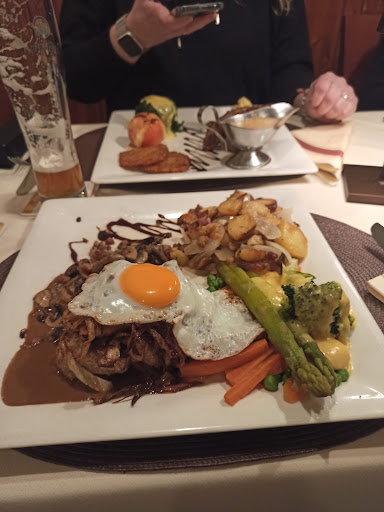Das Bierkutscherschnitzel, seit Jahren, wenn nicht Jahrzehnten noch immer auf der Karte und meine erste Wahl, hat leider nicht mehr viel von seinem früheren Geschmack behalten. Die Soße schmeckt sehr nach Tütensoße, die Bratkartoffeln vollgesogen mit Fett.
