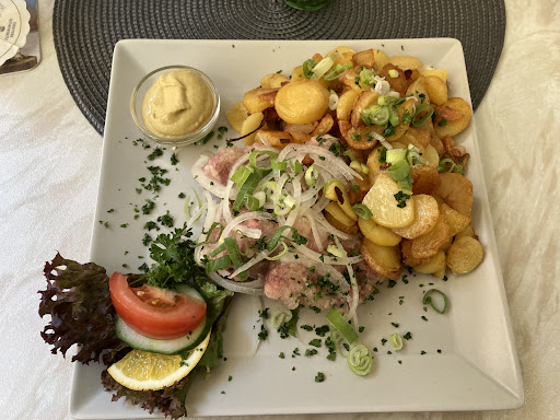 Read moreWir sind heute vom Campingplatz Hasselberg hierher geradelt, weil Google sagt, tolle Gerichte. Nun, ich kann dies zu 100 Prozent gerne bestätigen. Im Innenhof sitzt man im Außenbereich ruhig, gemütlich und sturmfrei. Die Bedienung ist aufmerksam und überaus freundlich. Das Schnitzel Wiener Art mit Salatbeilage und Pommes war absolut köstlich. Anmerkung: Ich esse normal kein Schweinefleisch und bin eher vegetarisch aufgestellt oder bevorzuge Fisch. Aber hier schon. Die Pomade um das Stückchen Schweinelachse ist selbstgemacht mit richtigen Semmelbröseln vom Bäcker, Ei und Gewürze. Das Fleisch extrem zart und in Butterfett knusprig gebraten. Knackige Pommes, köstlicher Salat. Die Bandnudeln mit Blattspinat waren zum Verlieben. Alles sehr reichlich. Bevor wir hier abreisen müssen, sollte ich unbedingt noch einmal hier verweilen....Klare 5 Sterne für Essen und Service. Zum Innenbereich des Restaurants kann ich leider nichts beitragen. Foto hab ich vergessen zu machen, das Essen sah viel zu gut aus, als dass man es warten...