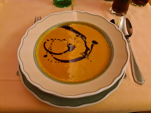 Das Essen wurde in der Karte auf hohem Niveau angepriesen, erwies sich aber "nur" als bodenständig schwäbische Küche. Die Kürbis-Creme-Suppe war wirklich gelungen (siehe Bild). Irritierend und dann leider doch nicht so überzeugend zeigte sich der Grill-Teller mit Bohnenbündchen und Pommes Frites, deren Beschreibung vornehm auf "Café de Paris" verwies. Die drei Stückchen Fleisch wurden faktisch jedoch grausam in brauner Soße ertränkt (siehe Bild) und schmeckten dann auch nur nach dem, worin sie schwammen. Es war mein erstes Grill-Gericht aus einem tiefen Teller. Rauch- oder Röstaromen, die man bei einem Grill-Teller wohl erwarten dürfte, konnten auch mit Mühe nicht herausgeschmeckt werden. Falls diese tatsächlich je existierten, sind diese in der braunen Soße ertrunken und gestorben. Es hätte deutlich mehr Pfiff gehabt, "Café de Paris" als Butter zu reichen und den Fleischgeschmack zu stützen statt ihn zu ertränken. Da sich auch die Beilagen zunehmend mit der braunen Soße vollsogen, war etwas Eile geboten, diese vor dem Ertrinken zu retten. Das Essen war deswegen nicht schlecht, aber bar jeder geschmacklichen Raffinesse. Im Lichte der nicht üppigen aber ausreichenden Portion war es seinen Preis bedingt wert aber ganz und gar nichts Besonderes.