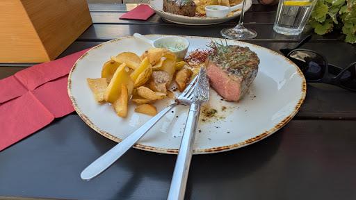 Really excellent service and food. We sat outside and watched people enjoying the early evening in town. We didn't plan to eat, but having seen what others were having we decided to have dinner here. Unable to make choices, we shared a burger and a salad and both were really tasty. The menu had some excellent local dishes and we'll be more adventurous next time we visit. Our waitress was friendly and completely made up for our lack of German. The restaurant inside was really nicely decorated, bright, clean and with quite modern styling. For our next visit we'll probably choose a table inside. Very good prices for excellent...