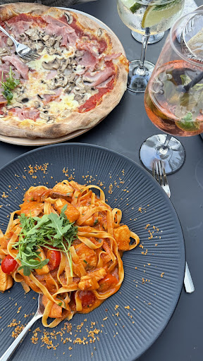 Kommen wir nun mal zu den Speisen. Das sah an den Nachbartischen ja alles sehr lecker aus, auch das Pasta Gericht welches meine Frau sich bestellte. Meine Pizza Frutti de Mare hingegen war optisch und geschmacklich eine einzige Katastrophe. Die Meeresfrüchte, Garnelen und Tintenfischstücke, bestanden meines Erachtens optisch und haptisch aus billigem Imitat, dem Surimi. Daher waren auch keine Muscheln oder kleine Tintenfische zu erkennen, und in der Speisekarte steht „Meeresfrüchte mit mediterranen Aromen“. Da sollte man stutzig werden. Enthält Surimi doch jede Menge Aromastoffe, die mal Garnelen- oder Krebsfleisch vorgaukeln.