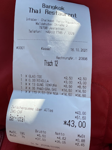 Read moreOverpriced and disappointing â not recommended for tourists. This restaurant really isnât welcoming for visitors. Thereâs no English menu and no Wi-Fi, which makes it difficult for non-German speakers to order or check dish details. The food itself was okay in flavor, but the portions were shockingly "very small for the price" Iâve had Tom Yum, fried rice, and papaya salad in Switzerland that were not only cheaper but also two to three times the portion size. For a small town like Jestetten, these prices are hard to justify. Overall,...