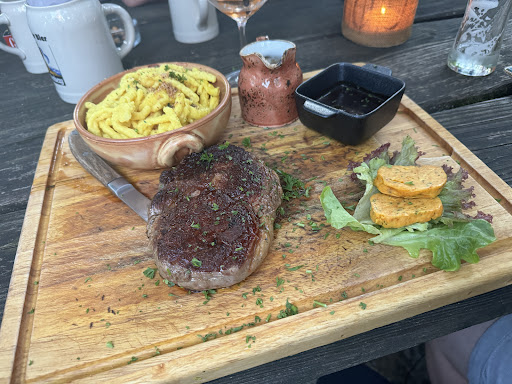 Von dem naturnahen und rustikalen Ambiente angezogen, haben wir uns an einem lauen Sommerabend ein Abendessen im Biergarten gönnen wollen. Leider gibt es kein alkoholfreies Bier auf der Karte und somit auch nicht, auf Kundenwunsch, machbar. Das hat uns für den ersten Eindruck stutzig gemacht. Nachdem wir dann schon das zweite Getränk inne hatten, "durften" wir auch Essen bestellen. Sind zwar eigentlich schon verhungert.... Das war dann nach einer Stunde. Die Bedienung, welche sehr nett ist, allerdings bedingt durch ihren Vorgesetzten unflexibel was Kundenwünsche angeht, brachte exakt unsere Bestellung an eine Gesellschaft, die erst seit kurzem da war, das hat uns dann nochmal stutziger gemacht. Zudem bekam ich mit, dass das Essen (was eigentlich unseres war), diese Gesellschaft nicht bestellt hatte. Schließlich kam dann irgendwann einer von drei Wurstsalaten. Der zweite Wurstsalat kam, war aber für eine Person von unserem Tisch, die erst später zu uns stieß und somit viel später bestellt hatte. Schließlich, als aller letztes, kam dann der dritte Wurstsalat. Dieser war leider, offensichtlich ohne Essig angemacht und so für einen Wurstsalat ungenießbar. Zudem haben die Beilagenbrote alle durchweg nach Plastik gerochen. Ich weiß nicht ob das gesund ist. Ich persönlich hatte einen Flammkuchen. Dieser war, wie man es sich vorstellt, auf einem Holzbrett serviert. Ich hätte allerdings beim Entgegennehmen des Holzbrettes nicht auf die Unterseite schauen sollen, denn dort klebten noch Reste des vorigen Flammkuchens wie z.b. Käse, Lauch etc.. Das fand ich dann doch echt eklig.