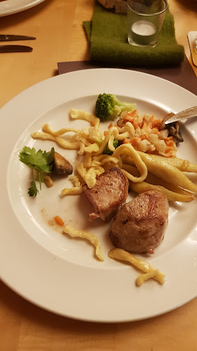 Das Essen an sich war lecker. Die Schweinebäckchen sehr zart. Aber satt bin ich nur von der Riesenportion Kässpätzle geworden. Als Garnitur eine geviertelte Cocktailtomate... hmmm... Vom Fleisch - Beilagenverältnis her war es ganz einfach 3 Stück Fleisch auf ein Teller voll Beilagen. Zumindest ist dies bei den Schweinebäckchen und dem Bärentopf der Fall (20-22€ pro Portion). Dafür gab es beim Schweinefilet in Calvadosrahm fast zuviel Fleisch. Der Zwiebelrostbraten und das Schnitzel waren ok. Ein Beilagensalat muss extra bestellt und gezahlt werden. Einen Nachtisch hatten wir schon vorab für zuhause geplant, daher haben wir recht bald gezahlt und nichts weiteres geordert.