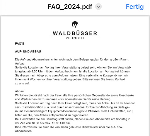 Das Weingut liegt traumhaft in Kleinbottwar und die Organisation war von Anfang bis Ende super. Marleen war immer pragmatisch und flexibel, wenn es um Anpassungswünsche ging. Was die Dienstleisterauswahl betrifft ist man beim Weingut Waldbüsser sehr flexibel (Empfehlungen bekommt man aber auf jeden Fall) und sollte lediglich den Service und die Getränke (was bei einem Weingut auch absolut verständlich ist) von der Location nehmen.