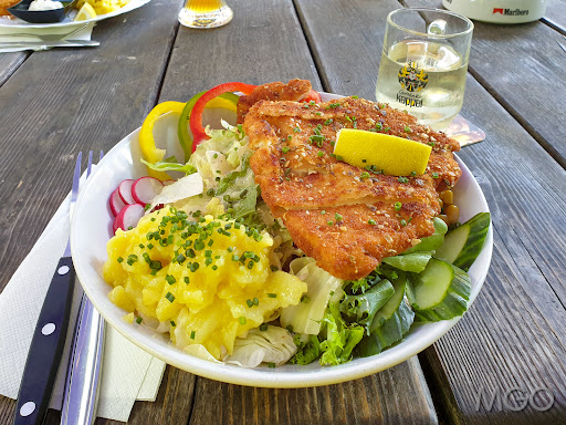 The latter was of good portion size and tasted quite nicely. If you enjoy a rustic lunch/dinner experience and favor traditional German dishes (lots of meat and chips, of course), then this is for you. You can also have "coffee & cake" in the afternoon - and just enjoy the typical beer garden atmosphere.