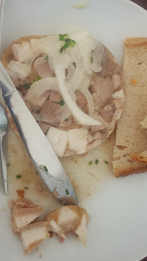 Die Sülze war eine gepresste Wurst von der man 2 Scheiben abgeschnitten hat. Darin enthalten waren viele Fettbrocken und die Sulz selbst war nicht gewürzt und gummiartig. Die Garnitur war ausser weniger Zwiebelringe und einer Scheibe Brot in 2 Hälften nicht weiter vorhanden. Ich habe die Hälfte liegen lassen.