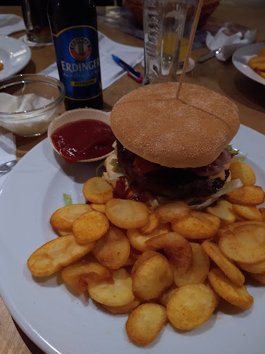 Read moreIch hatte den Cheese-Baconburger mit einer halben Portion Chips. Beides war super lecker, besonders die Chips waren knusprig und kaum fettig. Die Mitarbeiter waren sehr aufmerksam und sehr freundlich. Toll war auch, dass der Biergarten teils überdacht war. Der Tisch war schon lange gebucht, wir wollten gerne draußen sitzen und somit hätte es ruhig regnen können. Drinnen spielte eine Band und die Musik konnten wir gut draußen hören; hat uns gefallen. Es war aber keinesfalls zu laut, man konnte sich ganz normal...