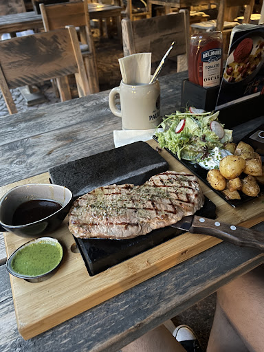 Die Hauptspeise, ein Schweinesteak mit Pommes frites und einem Rohkostsalat, überzeugte in jeder Hinsicht. Das Fleisch war sorgfältig mariniert, zart und von ausgezeichneter Qualität. Die Pommes frites, ebenfalls gut gewürzt, boten eine knusprige Textur, die den Gaumen erfreute. Der begleitende Rohkostsalat erwies sich als sättigende, aber nicht überladene Beilage, die durch ihre Frische und Schlichtheit bestach. Besonders hervorzuheben ist der Honig-Senf-Dip, der mit seiner raffinierten Süße und leichten Schärfe dem Gericht eine innovative Note verlieh.