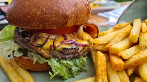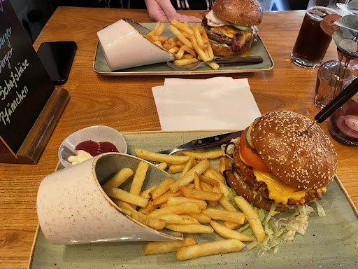 Nach ca 20 min kam das Essen und was soll ich sagen die Bilder hier lügen nicht. Richtig gute Burger mit sehr knusprigen Pommes. Mein American Burger war Weltklasse, das Fleisch perfekt auf den Punkt die Soße sehr stark. Frische Gurken geschmort rote Zwiebeln. Sehr lecker auch den kids und meiner Frau hat es sehr gut geschmeckt.