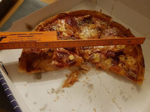 Read moreDer größte Betrug seit langem. 4 Pizzen bestellt und alle waren um einiges kleiner! 3 Pizzen sollten 29cm haben, eine war 25,5cm, eine 26cm und eine 26,5cm. Nach einem Anruf und bitte um Reklamation wurde sich herausgeredet und keinerlei Einsicht gezeigt! Zitat:" Es wäre ja logisch dass die Pizzen im Ofen eingehen und die 29cm nicht der fertigen Pizza entspricht sondern ihrer Form in der sie gebacken werden. Das ist schlicht und einfach Betrug. Wir haben sogar Fotos gemacht und können nur jedem abraten sich von solchen Ganoven über den Tisch...