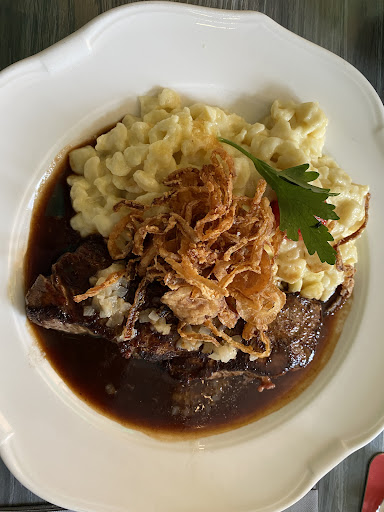 Versuch, leider fast kompletter Fehlschlag. Wir wollten heute das Restaurant testen, deshalb reservierte ich vor 10 Tagen einen Tisch. Soweit alles kein Problem. Heute angekommen ging es los. Ich habe einen Tisch für 7 Personen reserviert. Angeboten wurde uns ein Hochtisch (davon war bei der Reservierung keine Rede) der für 6 Personen ausgelegt war. Den Hochtisch konnten wir nicht nehmen, da wir 2 Rentner dabei hatten. Recht pampig brachte uns die Bedienung an einen anderen Tisch der eigentlich für 4 Personen ausgelegt wäre, aber an jedem Kopf noch ein Stuhl stand. Hier sollte dann noch ein 7 Stuhl einfach hingestellt werden. In Zeiten von Corona ein Unding, da weder am Tisch, noch zum Nebentisch so die 1,50 Abstand möglich waren. Mit den Hygieneregeln haben sie es da eh nicht so. Zwar muss man erwähnen das jeder Tisch nach der benutzung gereinigt wurde und desinfiziert, aber in unserem Fall wurden wir weder gebeten unsere Hände zu desinfizieren, noch wurden unsere Daten aufgenommen um im Falle einer Infektion informiert werden zu können. Das Personal incl Chef? bot keinerlei Problemlösungen an sondern redete sich immer nur raus das man nicht weis wer die Reservierung angenommen hat. Somit blieb uns nur der Tisch draussen im Biergarten in der prallen Sonne. Die Servicemädels waren zwar freundlich aber hmm wie schreibe ich das nett....etwas überfordert und mit wenig Weitsicht. A) hätte man fragen können ob man den vorhandenen Schirm aufspannen soll um nicht in der Sonne sitzen zu müssen, passierte aber nicht B) kann es ja mal passieren das man beim bringen der Speisen an das Besteck des Gastes kommt, dann aber so zu tun als hätte man es nicht bemerkt ist in Coronazeiten auch nicht das gelbe vom Ei. Service wäre gewesen zu sagen, sorry ich tausche die Gabel sofort aus, aber auch das passierte nicht. C) Der Service passiert aber auch nicht von den Vorgesetzten. Hier hätte ich erwartet das nach dem Fehler bei der Reservierung zumindest jemand an den Tisch kommt und sich nochmal entschuldigt und zumindest fragt ob man es mit nem Espresso oder ähnlichem wieder gut machen könnte. Wäre eine nette Geste gewesen, und hätte nicht die Welt gekostet. Weiter ging es mit den Speisen: Wir hatten 2x Schnitzel, 1, Rouladen, 1x Saibling, 1x Zwiebelrostbraten und Käsespatzen letztere haben weder als Hauptspeise noch als Beilage bei den Rouladen und dem Zwiebelrostbraten geschmeckt. Sie waren geschmacklos und sehr wässrig. Auch hier hörte man sich die Kritik zwar an, aber die Frage obs was anderes sein darf oder ähnliches blieb wieder aus. Zahlen durften wir alles aber schön brav komplett. Als Fazit.... Nobel gewollt aber weit verfehlt. Hier passt der Servicegedanke einfach nicht sondern es scheint als wird nur auf die Einnahmen geschaut. Fehler können passieren, aber man sollte dazu stehen und nicht auf andere abwälzen. Service und Dienstleistung sieht auch anders aus. Daher kann ich das Lokal leider...