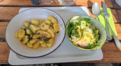 Die vegetarische Auswahl ist abwechslungsreich und liebevoll zusammengestellt. Ich hatte zum Beispiel Gnocchi in Salbei-Butter, dazu einen köstlichen Salat mit einem Senfdressing (siehe Foto). Mein Mann genoss Hugenottenkartoffeln mit allerlei Gemüse, getoppt von paniertem Feta (aus Schaf und Ziege). Meine Schwägerin hatte Pasta in Orangen-Gorgonzola-Sauce mit karamellisierten Nüssen. Wir waren alle begeistert.