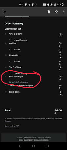 Read moreWir haben 2 Stunden und 45 Minuten!!! bis zur Lieferung warten müssen. Ich habe angerufen und wurde vertröstet mit "der Fahrer hat einen Fehler gemacht". Aber wie man auf dem Bon sieht, wurde die Bestellung einfach nicht bearbeitet, bis ich angerufen habe. Ich habe 2 x !!! extra eingefügt, dass ich keine Jalapeños auf dem Burger haben möchte. Extra unter Hinweis vom Anbieter aufgeführt. Den Burger musste ich leider entsorgen, weil Jalapeños darauf waren, welche die gesamte Schärfe an die Soße weitergegeben haben. Ich habe einmal hinein gebissen. Nun habe ich starkes Sodbrennen und eine geschwollene Lippe. Als Schwangere habe ich ja nicht schon genug Sodbrennen. Danke! Ich habe dort erneut angerufen und mich beschwert. Ich wurde ausgelacht. Sie habe den Hinweis nicht gelesen und sei nur für Sushi zuständig. Sie hätten einen neuen Burger geliefert, aber nach fast 3 Std. Wartezeit, und zu solch später Stunde macht das einfach keinen Sinn. Nie wieder!!!...