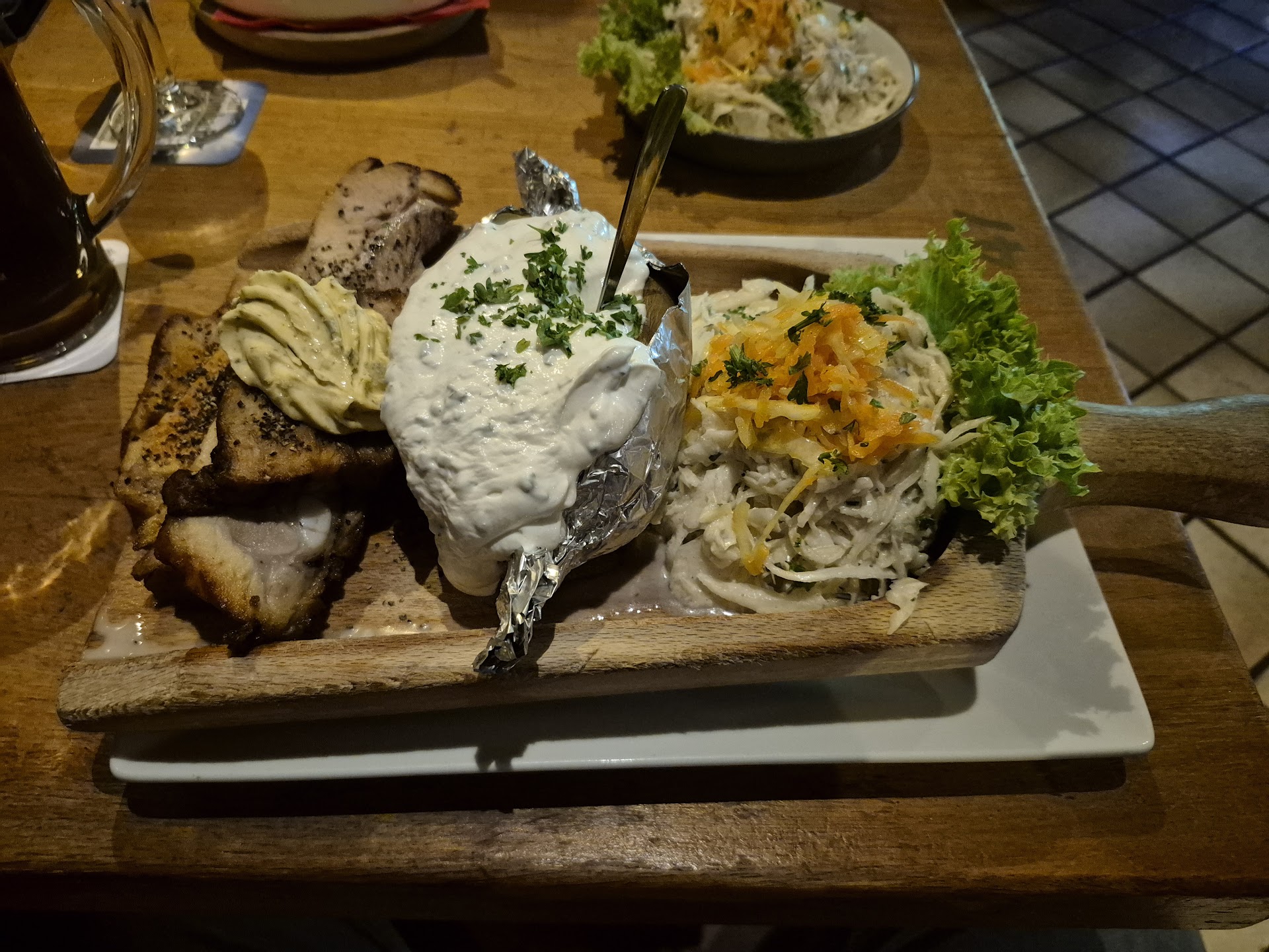 Der Hamburger laut meinem Sohnemann ein Gedicht - gut belegt - Saftig und einfach lecker - Würstchen natürlich auch aber es sind halt würstchen :-) - Der Eimer Knochen war perfekt - hier mit Knoblauchdipp der einfach ein Gedicht war - die Kochen gut bestückt mit Fleisch und perfekt Gewürzt. Mein Highlight war die Schweinde Medaillon (wobei leider 2 davon etwas zu lange in der Pfanne waren) mit der Rahmsauce. Was wirklich super war, hier waren mehr Champignons drauf als überall wo ich gegessen habe - was ich wirklich super finde denn was bringt mir eine Champignon Sauce wenn nur 2 Stück drauf sind :-) Vom Geschmack war die Sauce und das Fleisch einfach Genial - so gut habe ich schon lange nicht mehr gegessen.