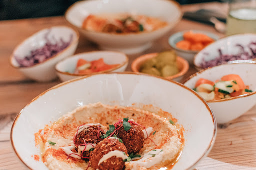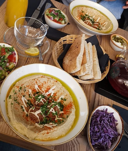 Read moreWenn Fusionküche hochtrabend angekündigt wird und fast ausschließlich eine Schicht Humus mit einer weiteren Hauptzutat wie Falafel als Hauptgericht präsentiert wird, ist das leider einfach schwach. Wenn man von einer Verbindung der orientalischen und europäischen Küche spricht, erwartet man einfach mehr. Immerhin bekommt man exakt nur das, was auf der Speisekarte steht. Z.Bsp. Humus mit 3 Bällchen Falafel einem Beilagensalat, zwei kleinen Pitahälften und einer frei-wählbaren Beilage. In meinen Augen wird hier ein ausgefallenes Restaurant präsentiert, aber man bekommt das Essen eines besseren Imbiss. Wer Wert auf gute vegetarische/vegane Küche legt, sollte lieber in ein vegetarisches/veganes Gericht in einem etablierten Restaurant essen. Dort bekommt man in der Regel mehr Qualität für den Preis. Ich hatte eine Humusbowl mit Schakschuka (übrigens das einzig klar erkennbare Fusion-Gericht) und meine Begleitung eine Humusbowl mit 3x Süßkartoffelfalafel. Humusbowl ist im übrigen wörtlich zu nehmen. Also eine Schale mit Humus. Nicht etwa eine volle Schüssel mit unterschiedlichsten Zutaten, wie man es etwa von einer Reis-/Asiabowl kennt. Zum Nachtisch - der übrigens Erzählungen zu folge sehr lecker sein soll - kam es leider aus gegebenen Gründen nicht. Die Bedienung war exakt zwei Mal bei uns (Bestellung aufnehmen, Essen und Getränke bringen). Zum Zahlen sind wir einfach nach unten gegangen, obwohl ich gerne noch etwas getrunken hätte, weil das Humus einem schon ordentlich Wasser aus dem Mund gezogen hat. Ambiente war einer modernen Aufmachung entsprechend in Ordnung. Das Restaurant spiegelt eher einen Lifestyle wider, anstatt eine oriental-europäische Küche. Im Übrigen eine (in meinen Augen) sehr gelungene Webseite! Wenn das Restaurant in der Varianz und Kreativität seiner Gerichte dem nachzieht, gebe ich dem Ganzen gerne eine neue Chance. Manche Bilder von hier geposteten Bewertungen kann ich so nicht...