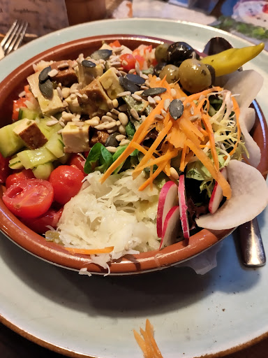 The vegetarian food was average; the beetroot carpaccio was decent, but the walnut dumplings were definitely not to my taste, although there wasn't another option. The sweet snacks were good, served warm. The place is absolutely exceptional, but it's definitely not a...