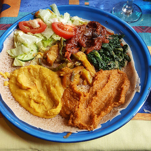 Read moreUnterm Strich überzeugend - Wir haben dieses Restaurant an einem Sonntagmittag mit 8 Personen getestet, im Vorfeld hatten wir entsprechend reserviert. Die Tische wurden bei unserer Ankunft von einer freundlichen Bedienung zusammengerückt, kurz darauf kamen die Speisekarten. Zur Auswahl standen 13 äthiopische und eritreische Gerichte mit Fleisch - darunter eine "Mischplatte" mit 3 Fleisch- sowie 4 vegetarischen Gerichten in "Probiergrößen" plus Salat - und 8 vegetarische bzw. vegane Gerichte (ebenfalls mit Mischplatte) plus Salat. Die Getränkekarte bietet eine kleine Auswahl an alkoholischen und alkoholfreien Standardgetränken sowie das afrikanische "Dju dju" Bier in vier verschiedenen Fruchtsorten und den "hausgemachten Honigwein" Tejj. Ein Dessertkarte gibt es nicht. Während die Wartezeit zwischen Ankunft und Ausgabe der Speisekarten bzw. Aufnahme der Bestellung etwas länger dauerte, waren sowohl Getränke als auch Speisen sehr rasch am Tisch (das Restaurant war zu dieser Zeit eher leer). Die Bedienung war sehr freundlich, hätte aber etwas professioneller arbeiten können. Das Anreichen der Karten, Speisen und Getränke geschah etwas unbeholfen, jedoch stets mit einem Lächeln. Sonderwünsche wurden tadellos umgesetzt. Die Speisen fanden nach und nach an unseren Tisch, bei der Zuordnung der vegetarischen Gerichte gab es ein wenig Verwirrung. Serviert wird das Essen grundsätzlich mit dem typischen Mais-Weizen-Fladenbrot Ingera (Sieht ein wenig wie Pfannkuchen aus und schmeckt etwas säuerlich). Es dient sowohl als "Teller" wie auch als Besteck und wird bei Bedarf nachgereicht. Gegessen wird mit den Händen, mit einem Stück Ingera wird das Essen aufgenommen und zum Mund geführt. Solche Tischsitten sind sicherlich Geschmackssache, aber auch eine Erfahrung wert. Die Portionen mögen zunächst eher klein erscheinen, sind aber durchaus reichlich und sehr schmackhaft. Wer kein scharfes Essen mag sollte seine Bestellung allerdings unbedingt "ohne scharf" aufgeben. Die Einrichtung des Restaurants spagatiert zwischen farbenfroh-afrikanisch und Kneipe (dies besonders bei den WCs im Keller). Die Preise sind für gießener Niveau eher gehoben, allerdings besucht man das Mama of Africa ja auch nicht nur um satt zu werden. Für ein interessantes Erlebnis und den klitzekleinen Kulturschock zwischendurch definitiv sehr...