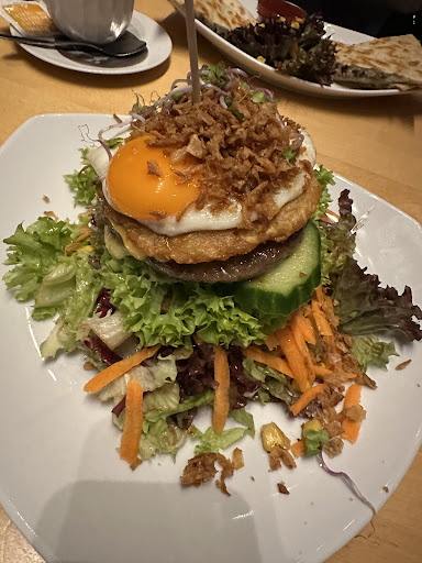 Auch andere Mitglieder unserer Gruppe hatten Probleme: Bestellungen kamen falsch an oder wurden gar nicht serviert. Geschmacklich konnte das Essen ebenfalls nicht überzeugen – der Burger wurde als fade beschrieben, der Hähnchensalat war sehr trocken. Mehrere Gäste klagten zudem später über Bauchschmerzen.