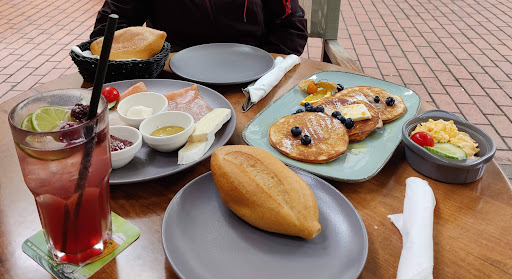 Das Essen hat super lecker geschmeckt! Wir hatten das Lachsfrühstück mit extra Rührei und Pancakes mit Butter und Ahornsirup, außerdem eine Brombeer-Limetten-Limonade (sehr süß, aber empfehlenswert). Das Frühstück war sehr gut und absolut ausreichend für zwei hungrige Sportler und die Pancakes waren super weich und genau richtig süß - mit dem Ahornsirup und der Butter absolut köstlich! Eine Enttäuschung war, dass nirgends auf der Karte Laugenstangen zu finden waren! Obwohl diese doch auch Teil eines jeden typisch deutschen Frühstücks sind. Allerdings war die Speisekarte total süß geschrieben und sehr leicht verständlich.