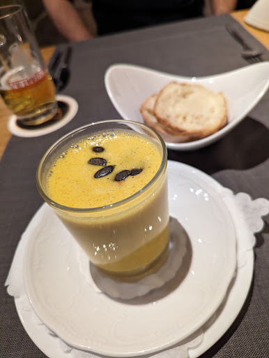 Tja, das Wasser war nicht außergewöhnlich. Normal. Okay halt. Kennt man. Dann hatten wir das aktuelle Abendmenü, angefangen mit einem Pfifferlings-Süppchen mit Zartbitterschokolade. Dazu das Brot mit Cranberries. 5 Sterne dafür, die Wucht in Tüten. Als Hauptgang dann Ochsenbäckchen mit frischer Pasta und Kalbsrücken unter Oregano-Steinpilzhaube mit Pfifferlingen, Gemüse und Steinpilz-Gnocchi. Die Ochsenbäckchen zerfallen von selbst, so zart sind sie. Das Gemüse perfekt, noch knackig, aber nicht roh. Und gut, wenn man beides probiert und querverkostet: die Gnocchi passen auch sehr gut zu den Bäckchen, und die Pasta toll zum Kalb. Noch mal 5 Sterne. Und als Dessert dann Rosmarin-Crème-Brûlée: Brüllkrem finde ich meistens recht "langweilig", insbesondere nach geschmacklich intensiven Speisen. Nicht so diese. Mit Obst und Erdbeersorbet ebenso der Knaller. 5 Sterne. Und als Digestif noch einen Nussknacker: Sherry und Mandel, riecht wie Amaretto, schmeckt nur viel besser: Sherry und Mandel nebeneinander in toller Harmonie. Bratapfel-Likör war auch sehr gut, aber der Nussknacker noch mal besser. 5 Sterne. Abgerundet wurde der Abend durch ein schönes Ambiente und einen freundlichen Service, der nichts zu wünschen übrig ließ. 5 Sterne. Aber ich wiederhole mich... Wir kommen so was von...