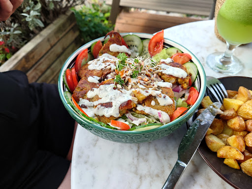 Read moreWir (mein Mann und ich) sind überzeugte Fleisch- und Fischesser. Aber wir haben ein überzeugtes Veganerpärchen kennen gelernt und uns wurde dieses Lokal als Lokal für leckere vegane Gerichte empfohlen. da wir imer aufgeschlossen sind Dinge auszuprobieren, haben wir einen Versuch gewagt. Das Lokal ist eindeutig für junge Leute. Es gibt keine Speisekarten, zum Bestellen geht man ins Lokalinnere und bestellt aus den aufgehängten Tafeln. Diese Vorgehensweise finde ich zwar nicht schlecht, aber ich vermisse eine Speisekarte in der auch die evt. allergisch wirkenden Inhaltsstoffe aufgeführt sind. Ich habe die vegane Plaumen-Zimt-Torte probiert und hatte leichte allergische Reaktionen. Im Nachhinein habe ich erfahren, dass sowohl in der Creme als auch im Boden Nüsse verarbeitet wurden. Die Gerichte waren geschmacklich wohl schmeckend. Aber ein Seitan Döner erinnert mich an Paniermehl mit Ei. Und der Hanfburger an einen weichen...