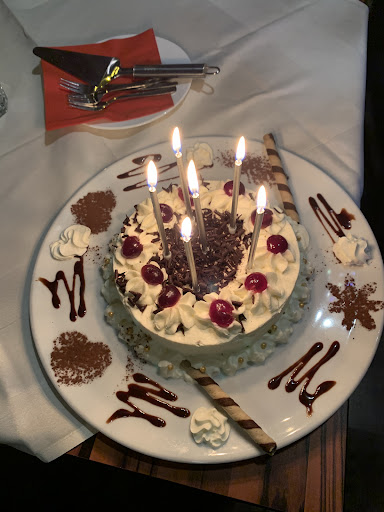Als Nachtisch wurden wir mit einer Torte auf der Geburtstagskerzen waren überrascht. Na gut, um die Torte mit Kerzen hatte ich im Vorfeld gebeten. Da das Restaurant keinen Kuchen in dieser Form anbietet hat es diesen extra vom Konditor besorgt. Also ich kann das Restaurant, insbesondere das Essen und die super freundlichen Mitarbeiter nur wärmstens Empfehlen. Wir kommen in jedem Fall wieder. Tipp: nicht ohne Reservierung hingehen wenn man am Wochenende dort...
