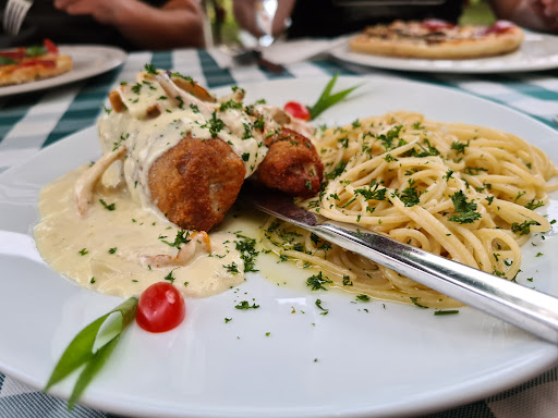 Auch das Essen stellte uns absolut nicht zufrieden. Pizza trocken (es fehlte an Käse und Soße), Spaghetti Bolognese waren nur ein riesiger Berg Nudeln mit ein wenig Hackfleisch und Zwiebeln ohne jede Würze. Dazu wässrige "Tomaten"soße. Und das schimpft sich Italiener. Wir können nur von einem Besuch abraten. Eine Katze lief übrigens auch noch hin und her und machte es sich dann gemütlich. Tiere haben in einem Restaurant nun wirklich...