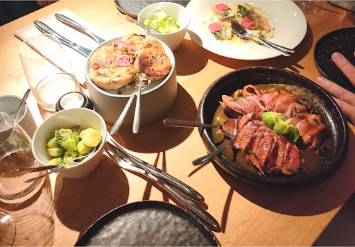 Knappe 4 Sterne. Eins vorweg, Essen echt klasse, wenn auch mit kleinen Schwächen. Wir waren zu Dritt dort und haben alle ein 5 Gang Menü genommen. Eingedeckt wurde aber nur 1x Besteck, und dabei blieb es dann aber auch. Somit mussten wir das eine Besteck für die ganzen Gänge benutzten. Kenne ich sonst anders. Bei unseren gewählten 5 Gängen macht man sozusagen eine Reise durch die Speisekarte. Ich persönlich hätte es hier besser gefunden, einen fertig angerichteten Teller mit der Auswahl zu bekommen. Hier werden die angerichteten Produkte (meistens 3 verschiedene) in der Mitte des Tisches hingestellt und jeder muss sich immer die Produkte selber auf den Teller ziehen/legen. Echt schöne Sachen dabei gewesen. Top, das Carpaccio vom Hirsch, leider aber nicht angemacht, und es stand auch kein Olivenöl oder Glace auf dem Tisch, womit man es dann hätte selber anmachen können. Die Gnocchi waren sehr sehr breiig, die Ochsenbäckchen (echt zart) aber zu lange gebacken (waren sehr trocken) und "ihnen" hätte ein bisschen eingedickte Soße sicher gut getan. Das waren aber auch schon die drei "Schwächen" beim Essen. Echt top war bei der Nachspeise, die noch richtig gemachte "Mousse au Chocolate". Service durch die Reihe, nett und freundlich. Bei jedem neu hingestellten Gang wurde erklärt, was da so vor einem steht. Wirklich nicht schön sind aber 2 Sachen. Der "Wohlfühl-charakter" fehlt. Dem Speiseraum fehlt jegliche Deko und es ist sehr sehr hallig (und somit der Lärmpegel laut). Zudem wird der gesamte Raum mega hell ausgeleuchtet. Fast wie in einer Mensa. Die Bestuhlung lädt leider auch nicht wirklich zum längerem Verweilen ein. Sehr ungemütliche Stühle - Fester Sitzstoff - ohne Polster, wirklich unangenehm, aber ist ein dünnes Brett als Rückenlehne. Eigentlich geht man ja nicht "raus", weil man Hunger hat. Man(n)/Frau möchte doch eigentlich einen gemütlichen Abend mit leckerem Essen verbringen... und ich finde, das die Gemütlichkeit durch die oben beschriebenen "Elemente" hier auf der Strecke bleiben. Wegen dem Essen würde ich jederzeit dort wieder hingehen, aber wegen der fehlenden Gemütlichkeit bleibe ich lieber fern. Besucht Anfang November 2022 / Preis-KATGO : 3x 5 Gänge, Getränke,...