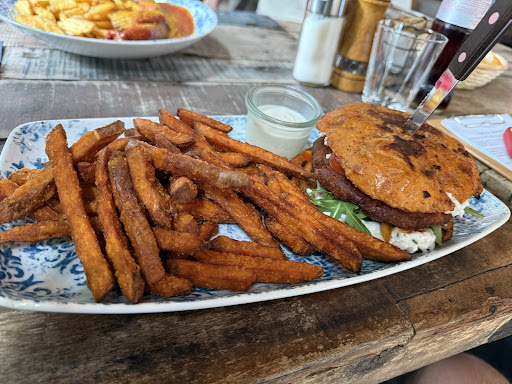 Die Burger, die wir bestellt haben, waren beide wirklich dürftig gewürzt. Ich hab meine Partnerin in den letzten 5 Jahren nicht einmal irgendwo "nachsalzen" sehen, dort war es nötig. Das Fleisch war wirklich lecker, das Bürgerbrötchen ebenfalls. Zu den Burgern gab es nichts. Einfach nichts. Kein Salat, keine kleine Beilage. Stattdessen haben wir uns unwissentlich Pommes mit Ketchup/Mayonaise aufquatschen lassen. Es war tatsächlich im Gespräch mit der Servicekraft nicht erkennbar, dass es sich dabei um eine extra Bestellung handelte. "Na gut, dann zahl ich halt für die Pommes, die scheinbar nicht dazu gehören... War bestimmt ein Missverständnis.", habe ich mir gedacht. Aber siehe da? Hier kosten sogar Mayonnaise und Ketchup extra? Für den Bürger samt Pommes und Mayo/Ketchup also solide 18€ gezahlt. Die Pommes waren ok, die amazing fries ein kulinarisches Highlight. Immerhin konnte ich den von mir bestellten Hendricks Gin Tonic "genießen". Zu dem gab es leider keine Gurke und die ist wirklich "basic" beim Hendricks. Stattdessen einfach Gin auf Eis und dazu eine Flasche "fever tree". Aber Moment? In der Getränkekarte stand doch, dass die Gin Tonics standesgemäß mit Schweppes gemischt werden, es sei denn man bestellt extra mit Fever Tree für einen Aufpreis von 2€. Tja habe ich nicht gemacht, aber bekommen und bezahlt habe ich es.
