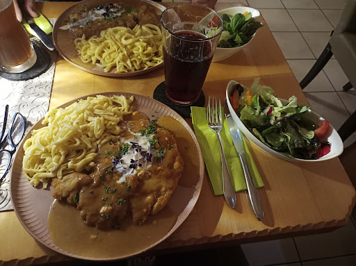 Gold in Goldbach When we first drove by, I noticed the stained glass windows of the building and the inviting decorations surrounding it. We decided to walk back after checking into our hotel and at first thought we stumbled into the wrong place because we heard a choir singing when we walked in. There was an unassuming door on the second floor marked ârestaurantâ and when we hesitantly opened it were welcomed into a cozy environment thronged with people and festooned with holiday decor. We sat at the bar and immediately made friends with Sandra and NiNi and the chef popped out and offered us Schnapps. Everyone was so kind and the atmosphere so festive that we came back the next night with family for dinner. I had the best schnitzel Iâve ever had in my entire life and the steak was delicious. I love that it was itâs own world as soon as you walk through the door and the people there made you feel...