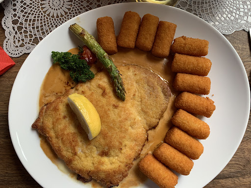 Gold in Goldbach When we first drove by, I noticed the stained glass windows of the building and the inviting decorations surrounding it. We decided to walk back after checking into our hotel and at first thought we stumbled into the wrong place because we heard a choir singing when we walked in. There was an unassuming door on the second floor marked “restaurant” and when we hesitantly opened it were welcomed into a cozy environment thronged with people and festooned with holiday decor. We sat at the bar and immediately made friends with Sandra and NiNi and the chef popped out and offered us Schnapps. Everyone was so kind and the atmosphere so festive that we came back the next night with family for dinner. I had the best schnitzel I’ve ever had in my entire life and the steak was delicious. I love that it was it’s own world as soon as you walk through the door and the people there made you feel...