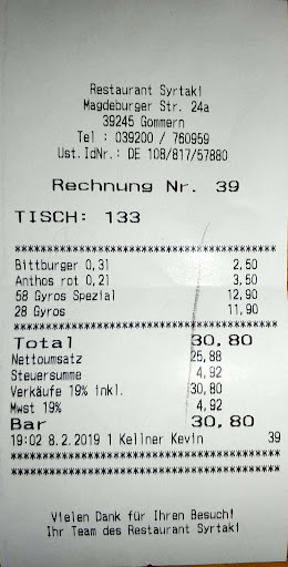 Read moreHaben heute zu zweit endlich den "Griechen Syrtaki" in Gommern ausprobiert. Es war sehr gut gefühlt, was wir geahnt haben und deshalb einen Tisch reserviert haben. Die Begrüßung war freundlich und es gab erstmal einen Ouzo für den Dopaminspiegel. :) Da uns zu Ohren gekommen war, dass die Portionen ordentlich sind, haben wir keine Vorspeisen bestellt. Wir wählten Gyros mit Zaziki und Gyros überbacken. Zu jedem Hauptgericht wird ein einfacher Blattsalat mit Krautsalat gereicht. Grieche eben... Dieser Salat war äußerst frisch und lecker. Keine 15 Minuten nach Aufgabe der Bestellung und Verspeisen des Salats standen dann auch schon die Hautgänge auf dem Tisch. Diese waren ebenfall super frisch und super lecker. Eines der besten Gyros, die ich je gegessen habe. Außen schön knusprig und innen herrlich saftig. Großes Lob an dieser Stelle. Auch das Zaziki und die Metaxasauce waren sehr aromatisch und mundeten sehr. Wir kommen wieder. Verbesserungswürdig wären mittelfristig aber: Toiletten Akkustik (Tip: Teppiche von unten unter die Tische kleben, schluckt ernorm Schall) Beleuchtung Vielen Dank für dieses tolle...