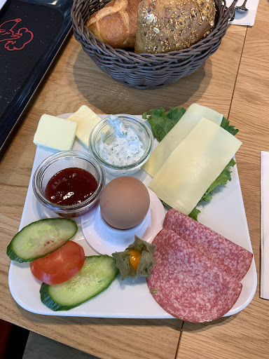 Der Standort der Bäckerei mit Aussenterasse ist echt gut gelungen.Die Einrichtung ist sehr schön und es lädt zum verweilen ein. Kompliment dafür. Vor ein paar Tagen waren wir zum Frühstücken da und hatten ein Frühstück für zwei, wir hatten uns schon gefreut auf die Marmelade(Hausgemacht) Käse , Wurst und Salat. Leider war auf dem Anrichte Teller das kleinste Blättchen Salat (der Rest Strunk) was man aus dem Salat noch raus nehmen konnte. Dann eine Scheibe Gurke die nicht frisch war und eine kleine Scheibe Tomate .Die Brötchen waren lecker . Im großen und ganzen Dachte man der Belag war schon mal auf einen anderen Teller gewesen.Denn hier auf der seite hatte eine Dame genau das gleiche Frühstück wie wir und dehren Anrichte Teller sieht viel besser aus.Und das bei dem Preis leider musste der Kaffee auch extra Bezahlt werden , man sollte so ein Frühstück mit Getränke anbieten. Andere Bäckerein bieten das an. Es ist auch nicht ansehnlich wo man sitzt das überall Krümel rum liegen. Dann wäre noch eine Sache Tiere gehören nicht im Restaurant. Habe auch Hunde und die bleiben entweder zu Hause oder draußen . Und da bietet sich ja die Aussenterrasse sehr gut an wenn man seine liebsten schon dabei...