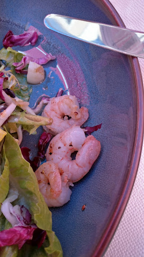 Serviert wurde nach 60 Minuten Wartezeit und Erinnerung durch den Gast: Billige Partygarnelen, Gemisch aus teilweise kleingeschnittenen Blattsalaten, Tomaten, Gurken, Paprika etc etc. Baguette waren zwei kleine Scheiben Bugette. Nach meiner Kritik erhielt ich die Aussage, dass der Feldsalat wohl zulange in der Marinade gelegen habe und deshalb nicht mehr frisch aussehe. Der Kellner erklÀrte mir, dass er sehrwohl den Unterschied zwischen Riesengarnelen und den kaum angebratenen Partygarnelen im Salat enthaltenen unterscheiden könne. Also wurden absichtlich billige Garnelen serviert.