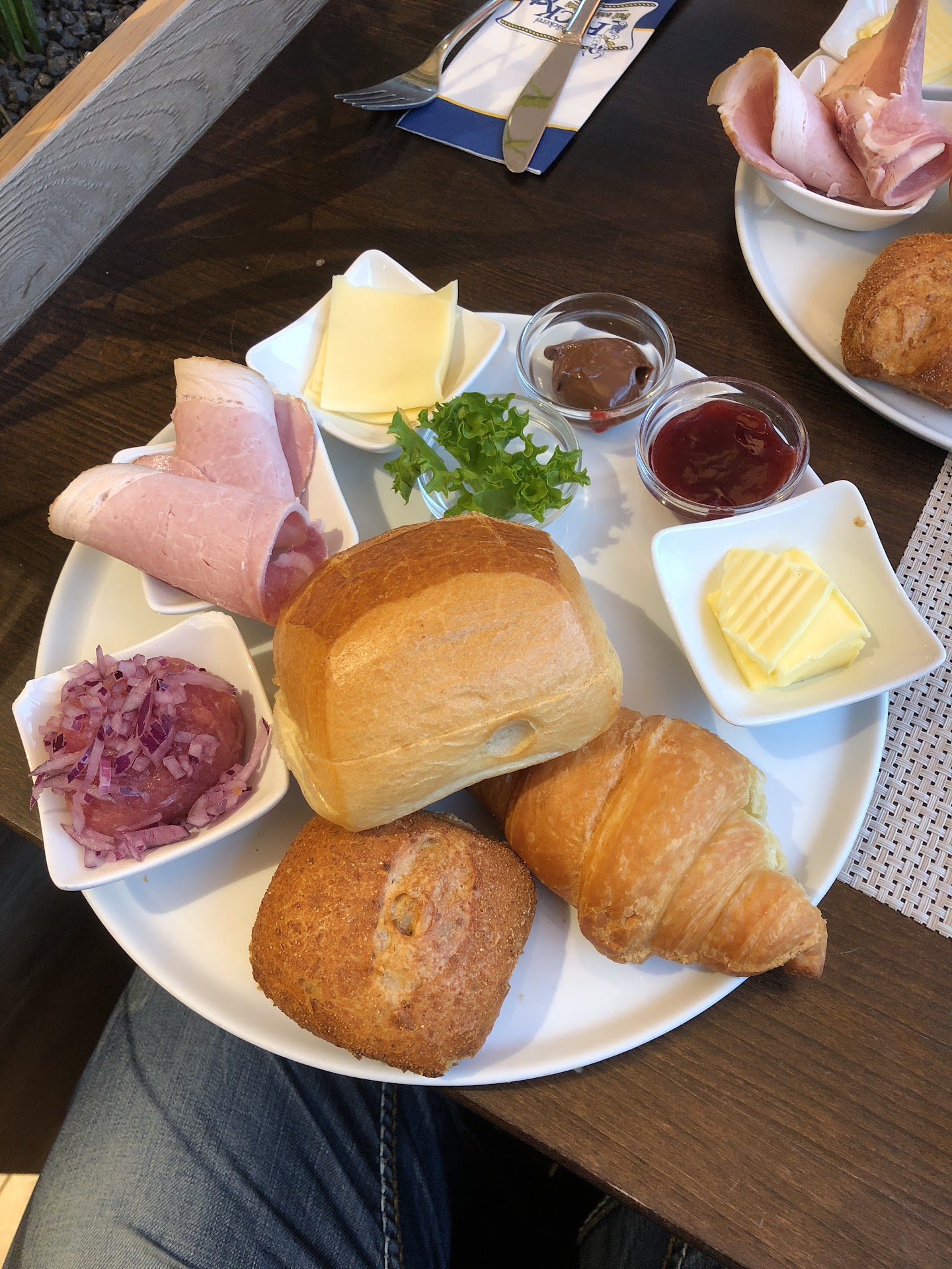 Frühstück ist frisch zubereitet, es gibt genügend Frühstücksvarianten zu Auswahl. Unsere Auswahl viel diesmal auf das „Gute Laune Frühstück“. Jede Beilagen Änderung kostet hier 0,50€, was der Bewertung zwei Sterne kostet. Beim „Gute Laune Frühstück“ sagt das Bild mehr aus als der Angebotstext. Von Mini-Brötchen und Croiissant steht da nichts drin. Bilder sind vom „Gute Laune Frühstück“ mit den Änderungen einmal Zwiebelmett (nicht frisch, aus dem Schlauch), einmal Käse, an Stelle von Salami. Das Personal ist freundlich, Teller werden zum Tisch gebracht. Brötchen kann man nicht selbst wählen. Der Extrakäse bei meiner Frau ist der gleiche wie schon im Angebot enthalten. Es wird beim Änderungswunsch auch nicht gefragt ob man Interesse an einer anderen Sorte hat. Dazu gibt es eine Große Tasse Kaffee oder Tee. Leider gibt es bei keinem Angebot O-Saft. Trotz Allem die Brötchen sind Lecker und Knusprig.