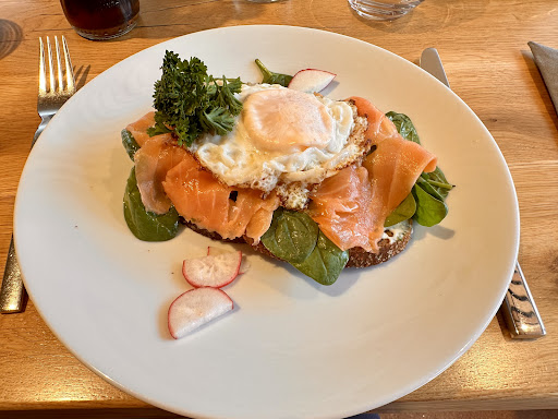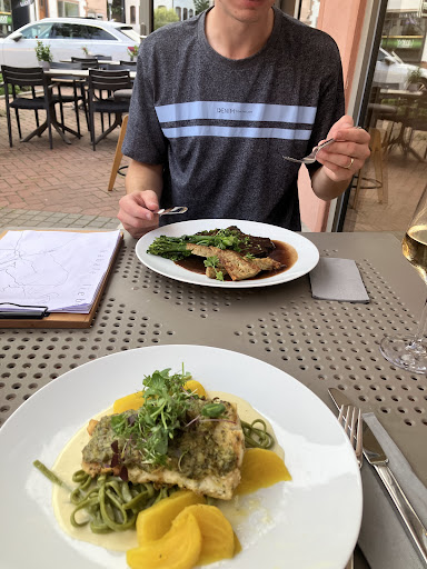 Read moreWir waren aufgrund einer Hochzeit in der Region zu Gast und haben uns aufgrund der Nähe zur Unterkunft hier zu einem Abendessen getroffen. Zu meiner Überraschung befanden sich auf der Speisekarte auch vegane Speisen, worüber ich mich sehr gefreut habe. Die Couscous-Erbsen-Bratlinge waren gut gewürzt, aber ein klein wenig trocken. Die Preiselbeeren vom Schnitzelgericht meiner Freundin waren eine gute Ergänzung. Ansonsten ein tolles Gericht und etwas ausgefallener. Danach habe ich noch den Chocolate Cake bestellt, der eher wie eine Mousse mit Füllung war. Geschmeckt hat er mir gut, auch der Boden, der an Rice Crispies erinnerte. Die Preise hier sind etwas gehoben, aber noch im Rahmen. Die Auswahl an offenen Weinen hat mir sehr gut gefallen. Die Bedienung war freundlich, allerdings haben wir teilweise etwas warten müssen, obwohl das Lokal nicht stark besucht war. Das Lokal ist sehr modern und chic...