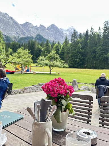 Read moreMy husband and I went at 13:00/1pm for lunch. We had the perfect outside table to look at the mountains and part of the lake. The gondola up to the Zugspitze was going back and forth but was not a bother at all, but kinda cool to watch! The food was delicious. We both ordered the schnitzel which was stuffed with bacon and a delicious mustard. Of course 2 helles on tap as well. The potatoes were perfect, not greasy at all but tender. We were so eager to eat it that I did not get a picture. For dessert we shared the Kaiserschmarrn which is a must if you visit! I'm a stickler when it comes to my cappuccino, I like it with the perfect froth consistency and they got it on point. There is a lovely area for kids to play. The atmosphere was very friendly. The staff was tops. I can...