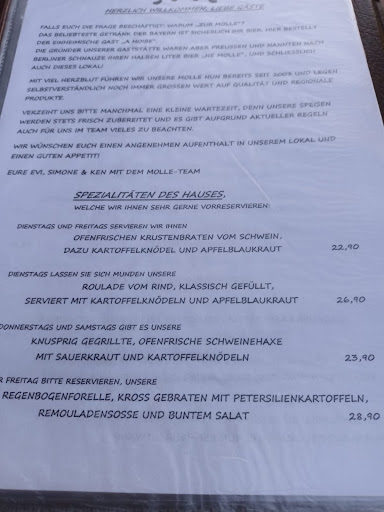 Enttäuschendes Erlebnis im Restaurant „Zur Mölle“ in Grainau Besuch am 17.06.2025, Tischreservierung 19:30 Uhr Das Restaurant „Zur Mölle“ in Grainau wirbt prominent mit einem Schild an der Straße für „Rinderroulade am Dienstag“. Mit Vorfreude reservierte ich daher einen Tisch für den beworbenen Tag. Leider wich das tatsächliche Erlebnis deutlich von der geweckten Erwartung ab. Bereits bei der Bestellung wurde mir von der Servicekraft mitgeteilt, dass die Rinderroulade bereits ausverkauft sei und man diese vorbestellen müsse. Ein entsprechender Hinweis findet sich jedoch weder auf dem Werbeschild noch in der regulären Speisekarte – nur bei der Forelle wird explizit auf Vorbestellung hingewiesen. Diese widersprüchlichen Angaben sorgten für Irritation. Statt einer offenen Kommunikation über die Verfügbarkeit der Gerichte wurde mir eine Erklärung präsentiert, die sich später als nicht zutreffend herausstellte. Besonders kritisch sehe ich, dass weiterhin mit der Rinderroulade geworben wurde, obwohl sie nicht mehr angeboten werden konnte. Das hätte durch ein einfaches Abdecken des Schildes vermieden werden können. Nachdem ich als Alternative Hirschgulasch bestellte, wurde mir nach längerer Wartezeit auch dieses Gericht abgesagt. Auf Nachfrage reagierte die Inhaberin mit weiteren Ausflüchten und präsentierte eine alternative Speisekarte, in der die Vorbestellung der Rinderroulade vermerkt war – in der regulären Karte fehlte dieser Hinweis jedoch weiterhin. Die Kommunikation empfand ich als wenig transparent und im Umgang mit Kritik als unprofessionell. Am Ende verzichteten wir auf das Essen; die Getränke wurden uns kulanterweise nicht berechnet. Leider hinterließ der Besuch einen enttäuschenden Gesamteindruck: Irreführende Werbung, widersprüchliche Informationen und ein wenig kundenorientierter Umgang mit Kritik sind für mich klare Schwachpunkte. Ich hoffe, dass das Team des Restaurants diese Hinweise als konstruktive Kritik versteht und Verbesserungen vornimmt. Aktuell kann ich das „Zur Mölle“ leider nicht weiterempfehlen.