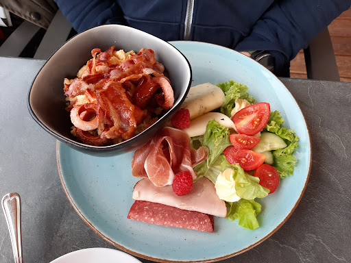 Zum Essen und trinken: Ich hatte ein Cappuccino und ein Stück Pflaumenkuchen und ein Wasser. War lecker. Die Sahne war leider schon verlaufen, da der Cappuccino 50 Minuten später als der Kuchen kam und ich so lange warten musste.