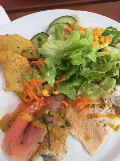 Read moreDie Karte ist übersichtlich, Schweinsbraten und Knödel gibts hier nur an Sonn- und Feiertagen. Ich war in den letzten 3 Wochen dreimal hier beim Essen. Es war jedesmal sehr gut. Zwiebelrostbraten mit Käsespätzle, Fleisch groß und auf den Punkt wie gewünscht gebraten, tolle Röstzwiebeln, leckere Kässpätzle und besonders zu erwähnen ist die Soße, die dabei war. Die war so gut, ich hätte den Teller fast abgeleckt. Begleitung hatte Gulasch, war fein, wie von der Mama. Zum Nachtisch gans dann noch ein Stück Nuss-Krokant-Sahne-Torte und einen Cappuccino. auch sehr fein. Nächster Besuch dann Forellenfilets gebraten mit Salzkartoffeln auf Rahmwirsing, mit Meerettich, was zusammen perfekt geschmeckt hat, der Wirsing war sehr gut gewürzt, der Meerettich frisch und bissi scharf, wie es gehört. Begleitung hatte die veganen gefüllten Teigtaschen. Die waren auch überraschend lecker, mit rote Beete Füllung und vielen kleinen Goodies dabei (Rucola, Granatapfelkerne etc.), sehr liebevoll angerichtet, das hat uns sehr gefallen. Leider hatte keine Torte mehr Platz, obwohl die Auswahl wieder sehr gut ausgesehen hat. Beim dritten Besuch gabs für mich die 1/4 Gans mit Rotkraut und Knödel, die ich mir beim letzten Besuch nicht leisten wollte (Preis 29,80 Eur warens glaub ich). Nach den zwei positiven Erfahrungen hab ich es gewagt und es hat sich gelohnt. Die Gans war knusprig resch und geschmackvoll gewürzt, innen saftig und zart. Knödel locker, Blaukraut wie es gehört und nicht total überwürzt und/oder bazig verkocht, es war einfach gut. Ein wirkliches Fest für mich. Ich hab alles ratztputz aufgegessen, deshalb war auch diesmal kein Platz mehr für Torte, obwohl wieder eine feine Auswahl in der Vitrine bereit stand. Meine Begleitung hatte das Schnitzel mit Bratkartoffeln, hier gabs auch nix zu meckern. Zweite Begleitung hatte den Fisch, der genauso fein war, wie bei mir die Woche zuvor. Leider gibts keinen kleinen Beilagensalat, aber wir haben dann mit Hilfe der sehr freundlichen und zuvorkommenden Bedienung eine Lösung gefunden, mit der wir zufrieden waren. Massig Parkplätze, rundrum kann man schön spazierengehen. Sehr...
