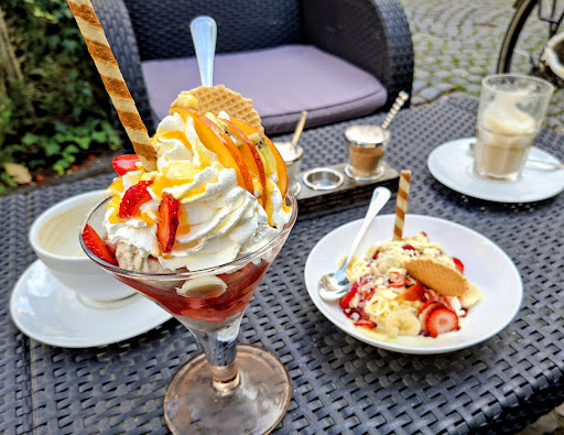 Die Kommunikation mit den Gästen ist offen und herzlich sowie mit Humor gespickt. Der Service ist ausgezeichnet. Das Café sowie der Freisitz ist sehr sauber und gepflegt. Die Kuchen sind, wie auch die verschiedenen Eisbecher und Kaffee, durchweg ausgezeichnet.